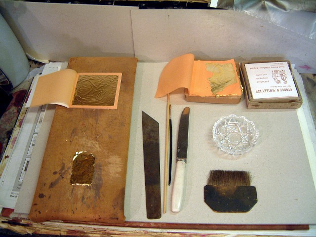 After heating and cooling the tools, the edges are blind tooled and glaired The gold leaf is laid on, the tool heated to temperature again and the first line of gilding is run around the edges of the board. The head and tail edges are gilt using corner pieces and small hand tools.