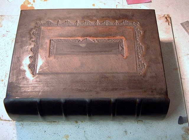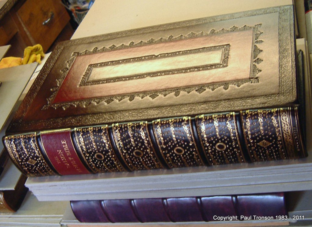 The edges of the boards and the inside edges are also blind tooled before the end papers are pasted down. The tallow is removed and the book is polished with a hot iron and prepared for gilding. The spine of a Bible this size will take up to 1000 impressions of tools in gold leaf.