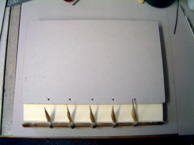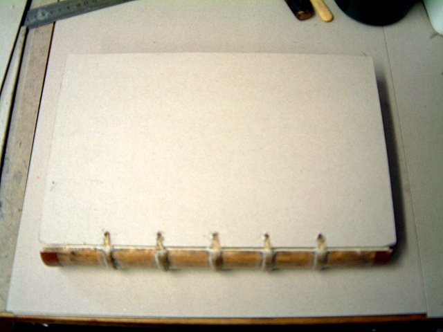 To begin this style of book binding the book is flexibly sewn on raised cords with laced-in boards which are splayed out and secured within.