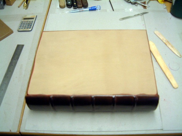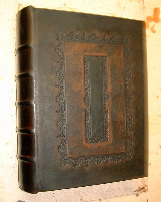 After applying the colours I make a “tallow” compound of bulls fat and other properties and coat the whole of the book, this prevents the hot tool from scorching the surface of the skin by cooling it slightly, it also acts to burnish and blacken the impression the tool leaves behind.