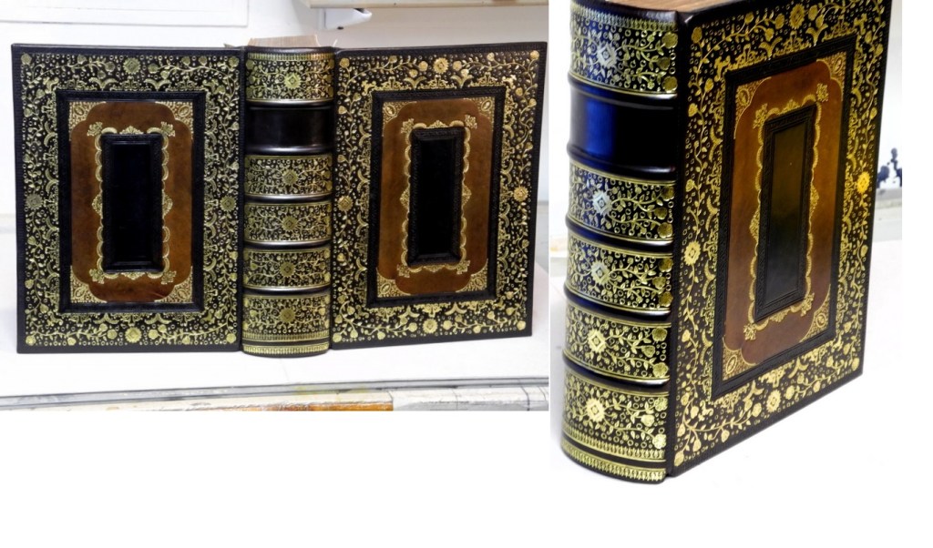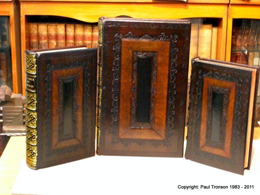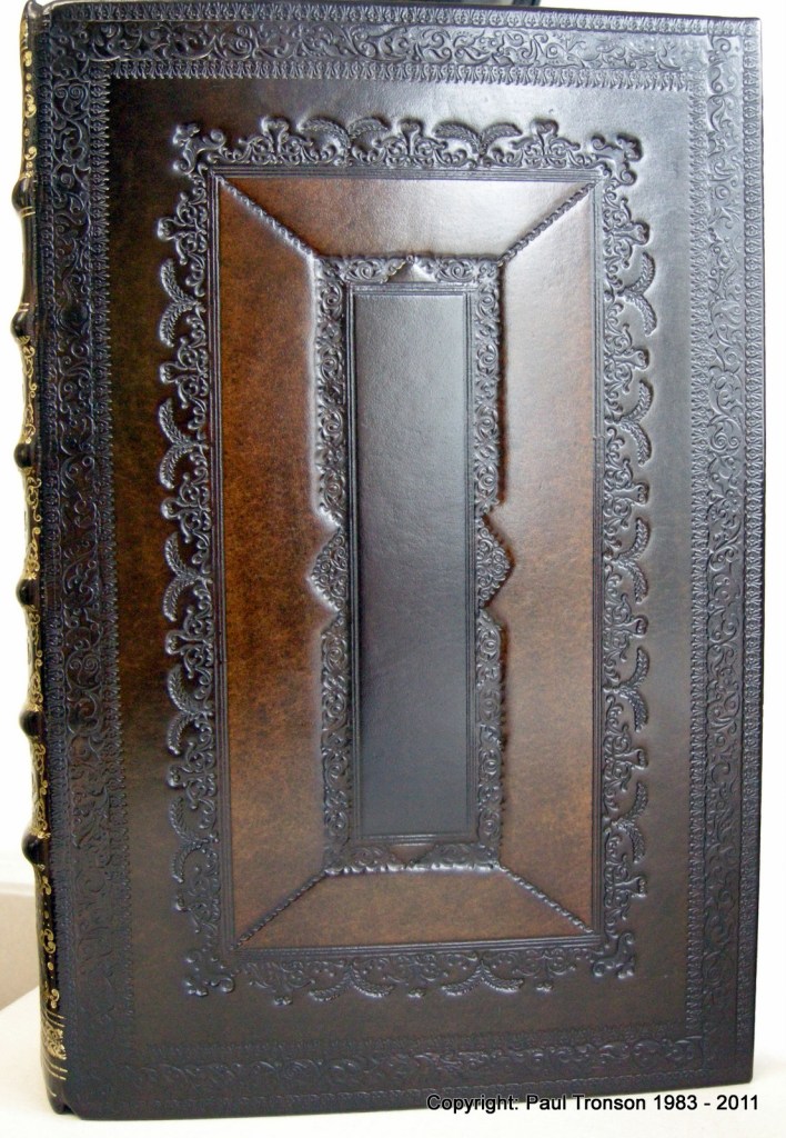 The versatility of the Cambridge panelled calf is such that the tooling may look similar or even the same until you match two different volumes together and find either complete differences or a subtle variation of the same tooling…..This particular client is so enamoured with the style and requested slight variations in the tooling for their own books….A serious library can be identified by specific tooling. The images shown are my own personal variations for rare books that warrant a finer binding.
