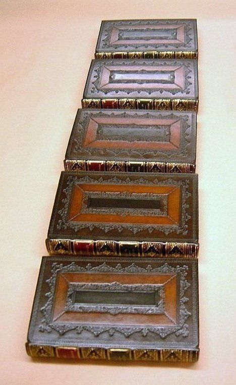 Through every period of book binding since the early 1600’s the Cambridge panelled calf has been one style of book binding that has always retained an air of quality and craftsmanship whether they are single large folios, multiple volumes in folio, quartos, octavos on whatever subject.