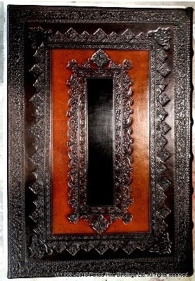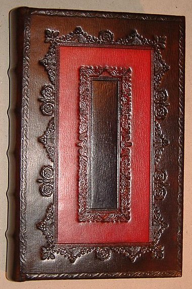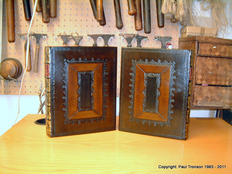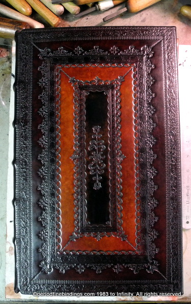 The blind tooling comprises of small hand tools and fillet rolls (decorative wheels)creating a perfect (well almost) symmetrical pattern resulting in an authentic contemporary design