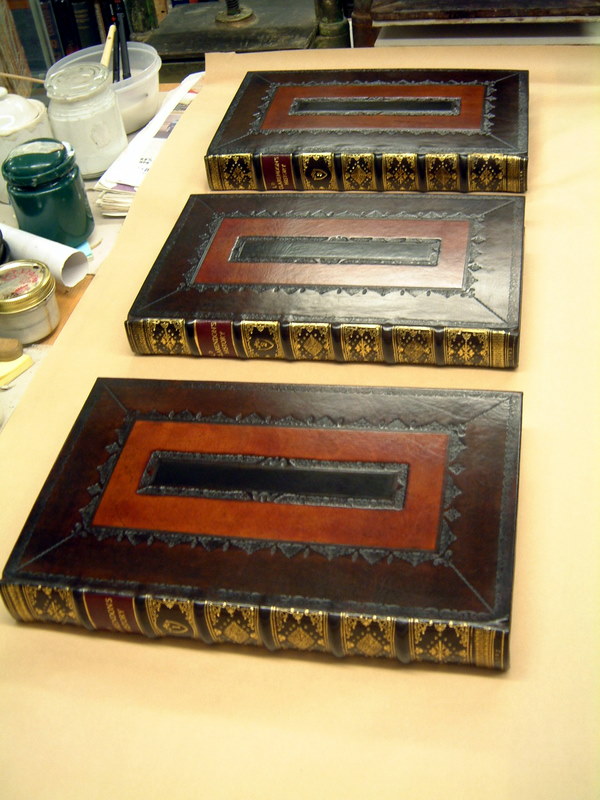 Folios Quartos and Octavos in different depths of browns, reds and blacks, some speckled some not, but all looking and feeling quite authentic in their new bindings.\