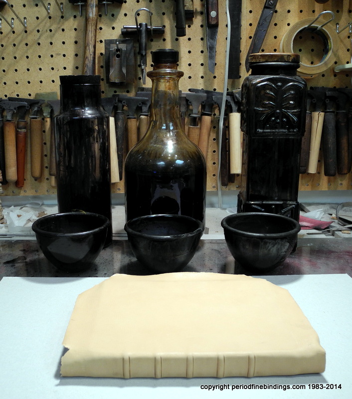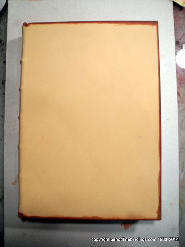 The book is bound so now all the work is done ON the finished binding, so there is NO margin for error whatsoever. The dyes are fermented from plant extracts and 3 colours are chosen and applied.