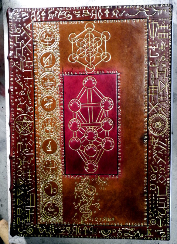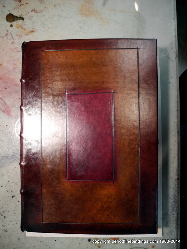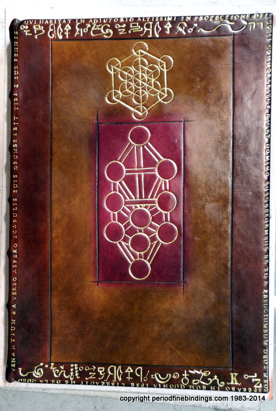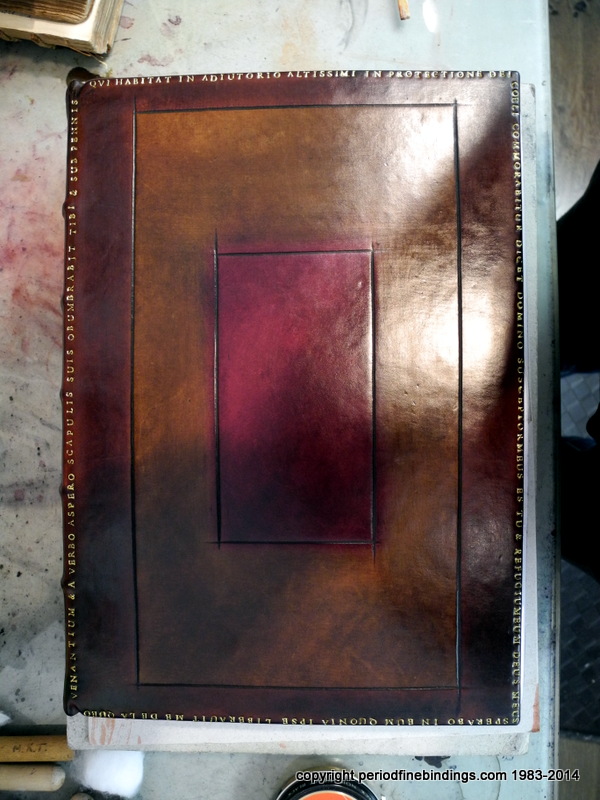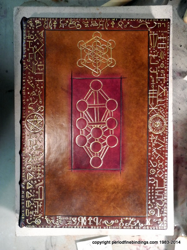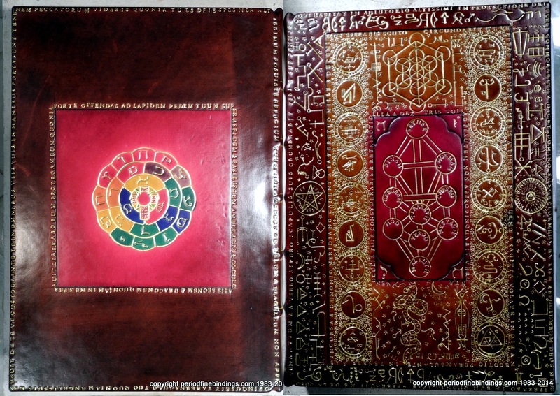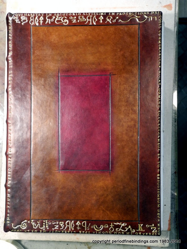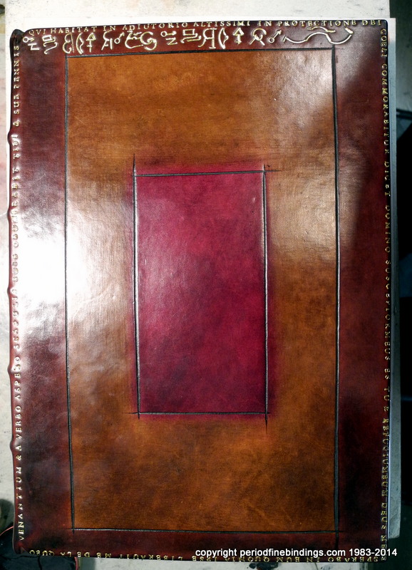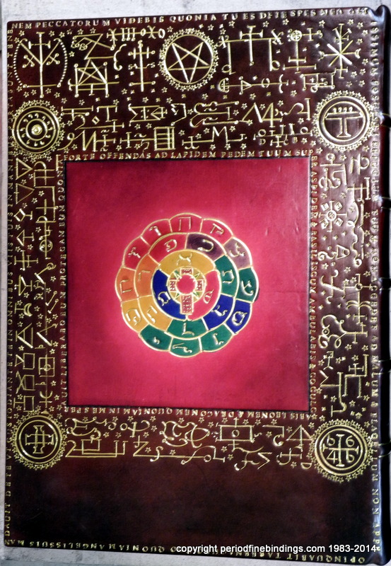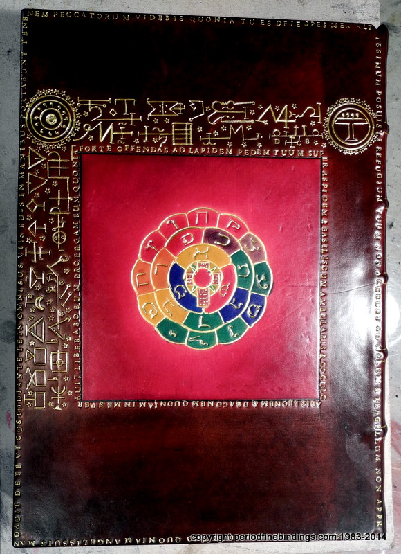 This is a little trickier as I had to make special dyes to get the colours right for the Rose Croix which is inlaid and gilt. The Latin text continues all around the book.