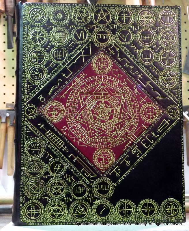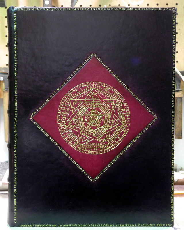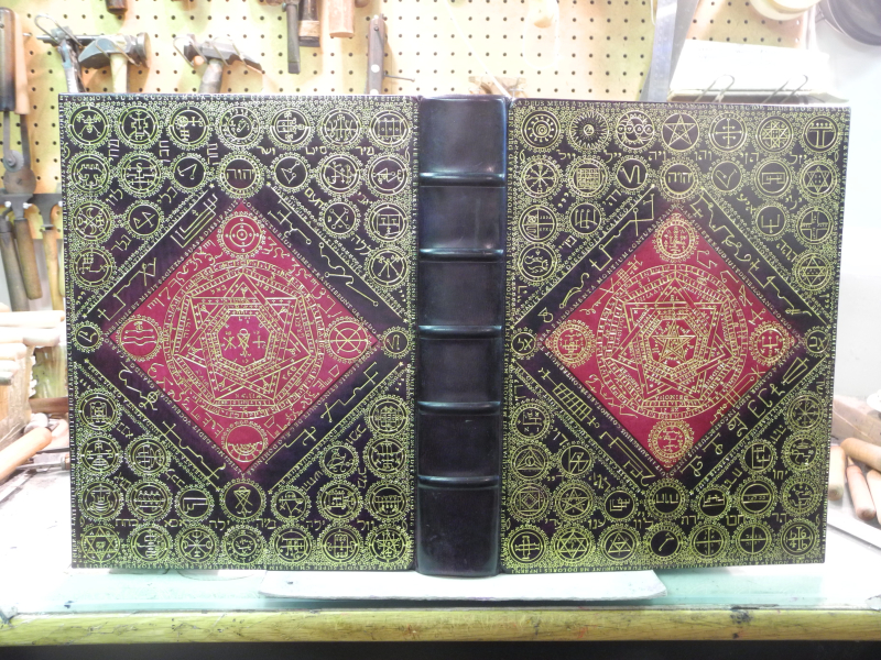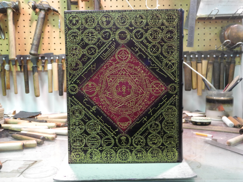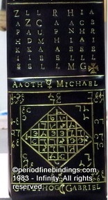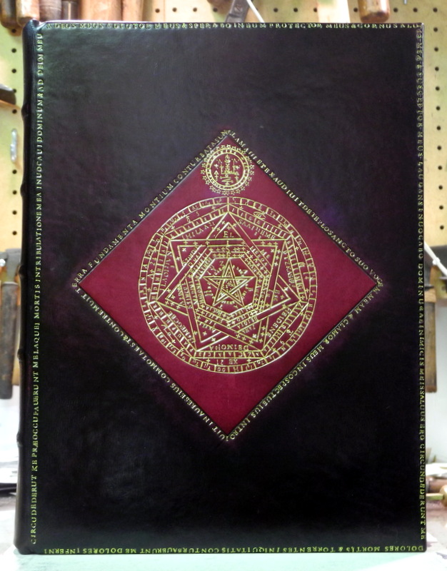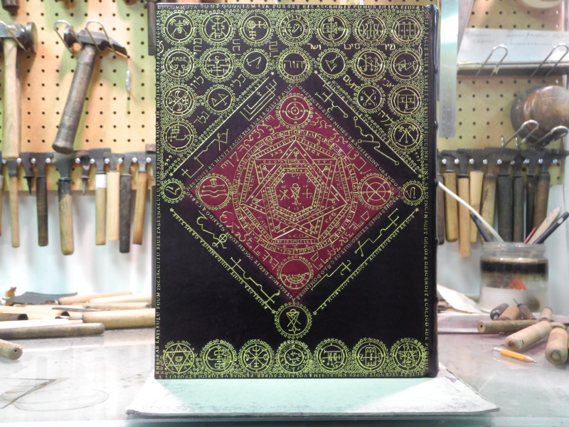 The spine completes both the Sigillum dei Aemeth and the Sigillum dei Lucifer. The demonic Lamen being at the head. The right hand picture shows how the lettering is “blinded” in first and the gold leaf tooled in exactly the same place.
