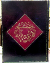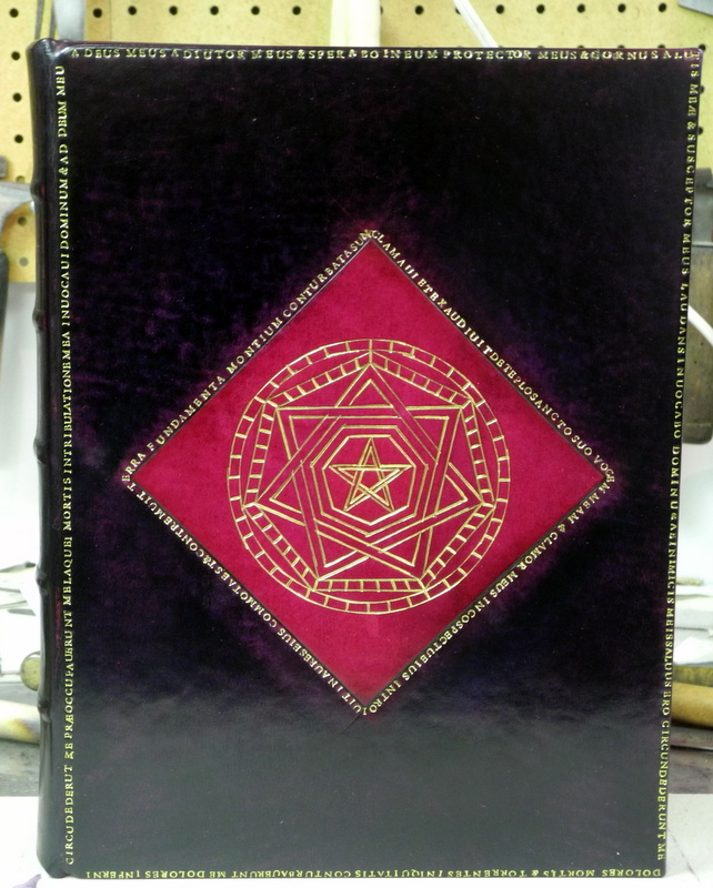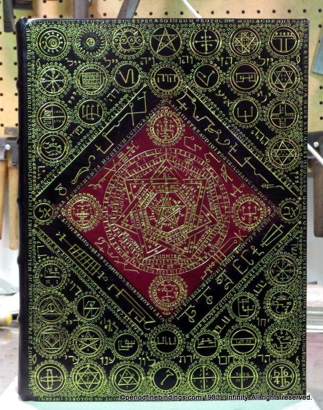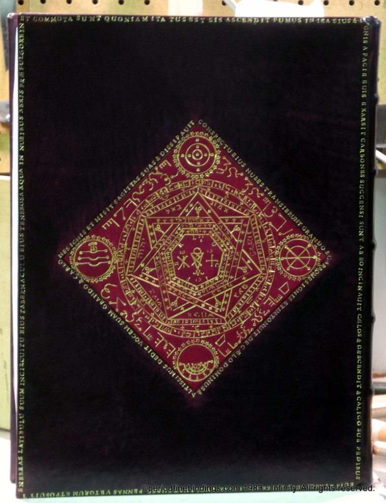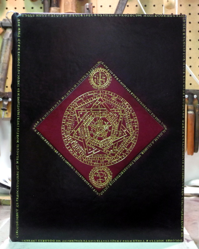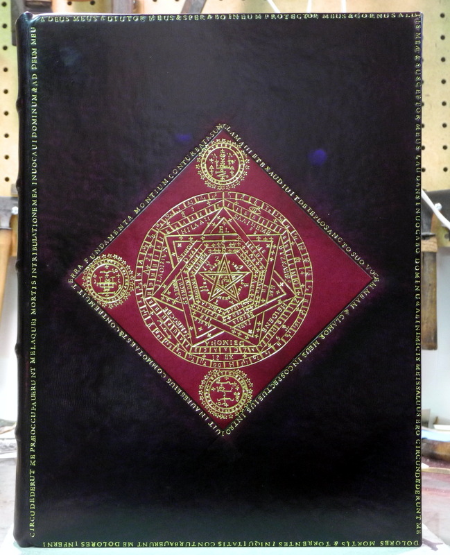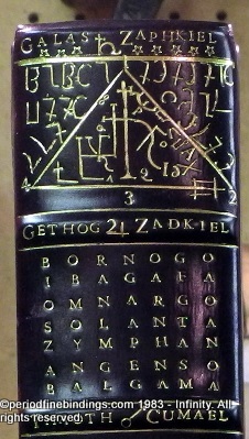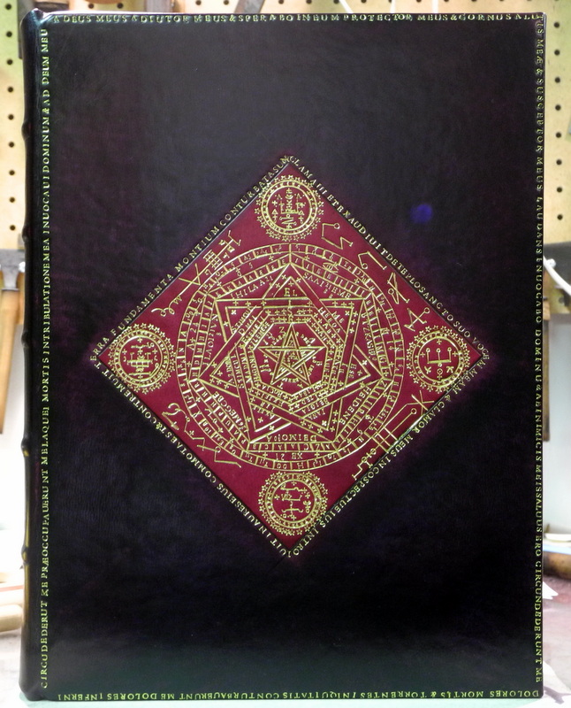 The spine completes both the Sigillum dei Aemeth and the Sigillum dei Lucifer. The demonic Lamen being at the head. The right hand picture shows how the lettering is “blinded” in first and the gold leaf tooled in exactly the same place.