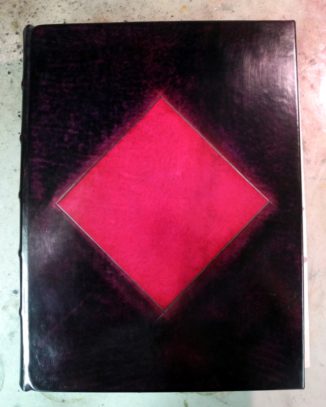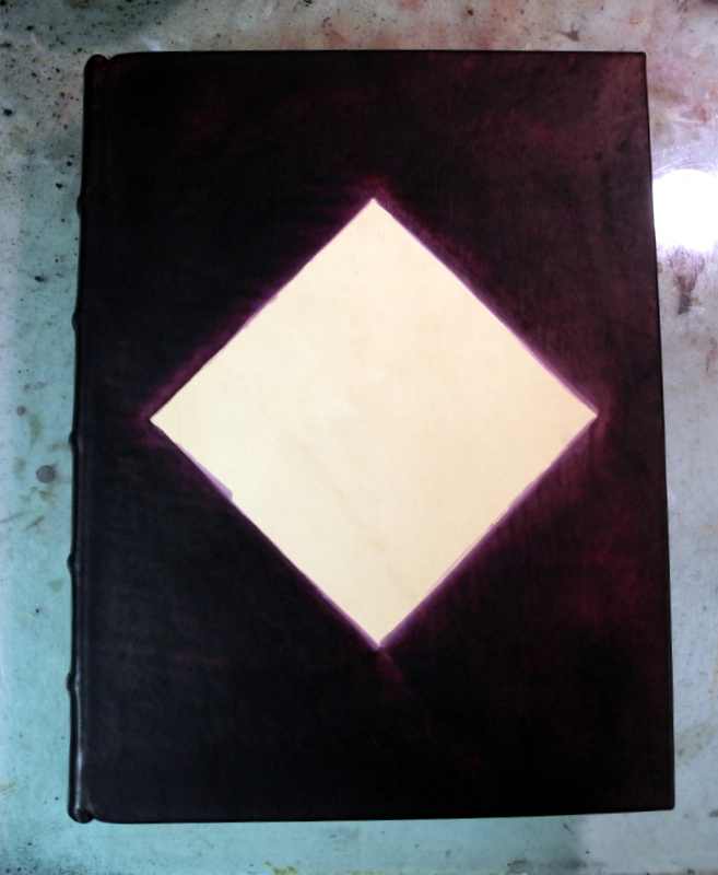 The book is bound in a raw veg tan skin and hand coloured on the book. The colours I have used are dyes I make myself which are fermented black plums and cochineal and beet. All the work is carried out in planetary days and hours.