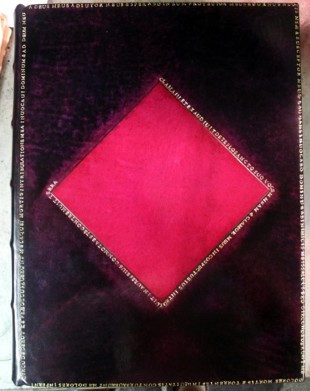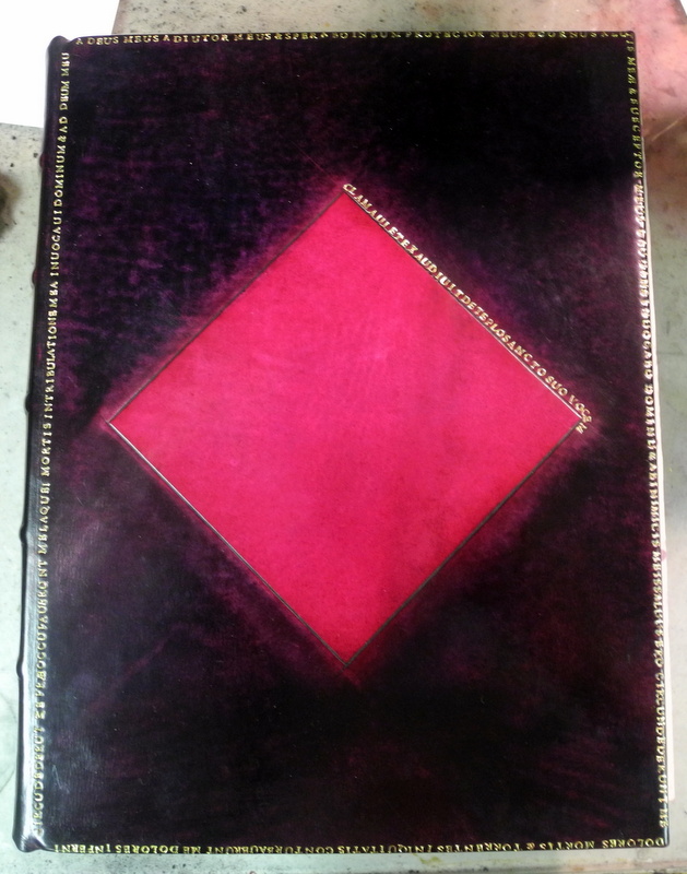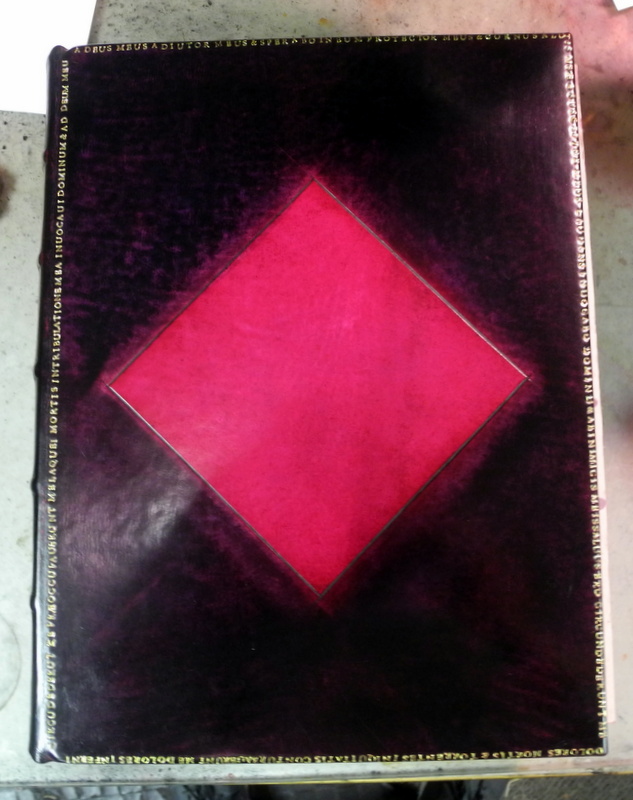 A Latin text is then hand lettered in 24 carat gold leaf around the edges, each letter blinded in first and then over tooled again in gold leaf.