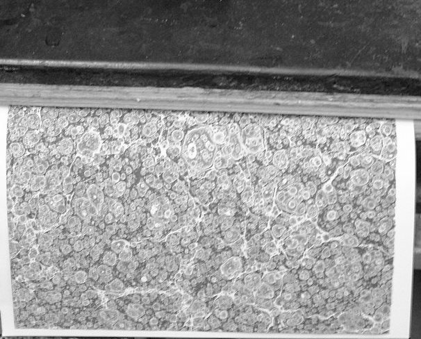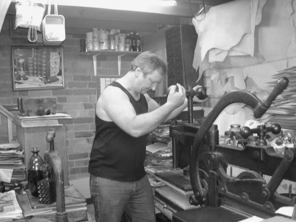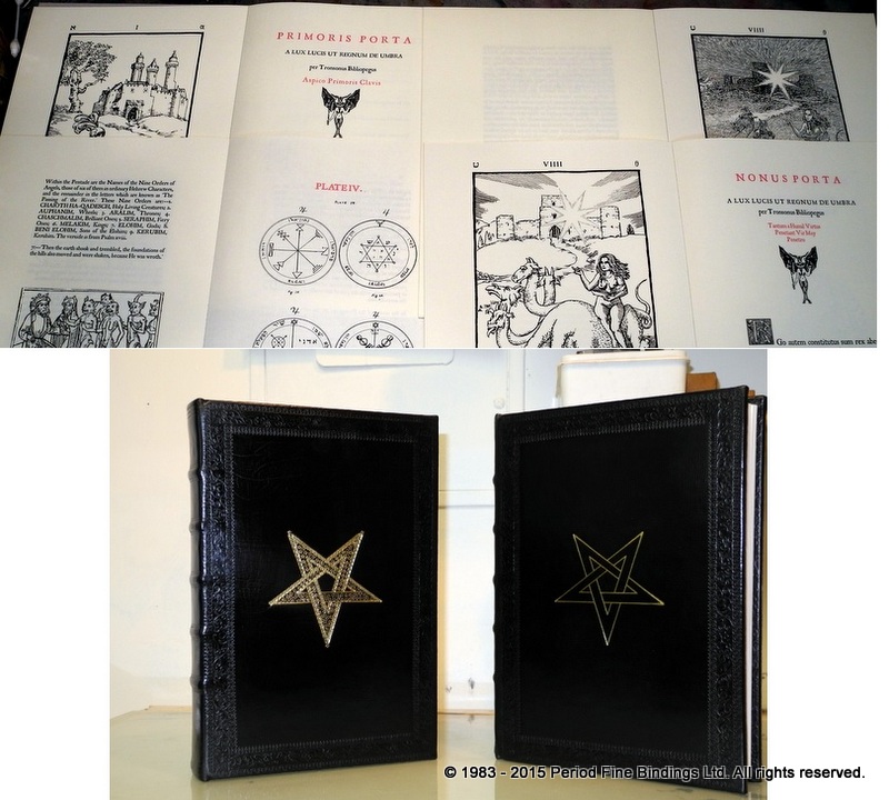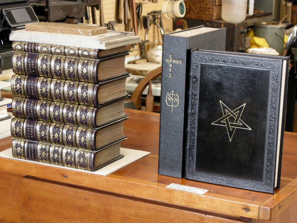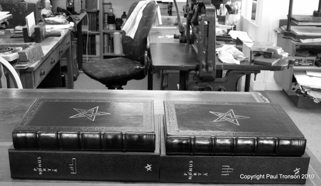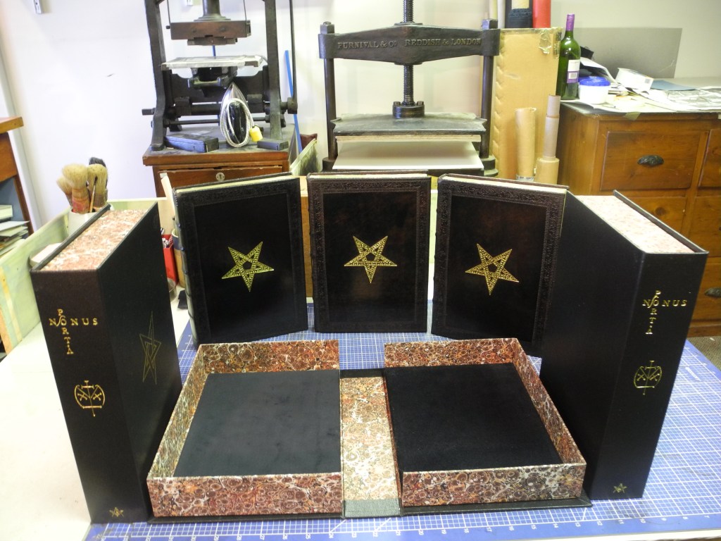 The end papers are hand marbled black or brown and sewn in, the book is trimmed on 3 edges with the option of having the edges gilt and “gauffered” with Sigils…..The spine rounded and backed. Head and tail bands are hand made and sewn in before the boards are made, laced onto the book block and splayed out. To watch some videos of Paul’s work and ‘The Making of the Nonus Porta‘ plus other interesting stuff….
