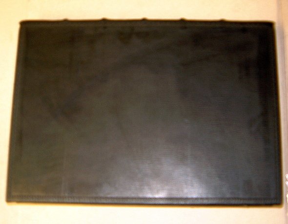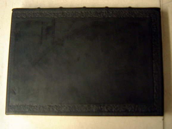 The chosen leather is vegetable tanned, consecrated virgin calf. The skin is paste washed thoroughly and Picric acid is applied to give an even yellow colour. An even coat of Salts of Tartar is then applied to give a rich brown colour followed by a final coat of Ferrous Sulphate which changes the skin to a rich midnight black colour which is then “fixed”. The skin is then cut to size and a grain is bordered into it by hand before ironing out and paring by hand on all edges.