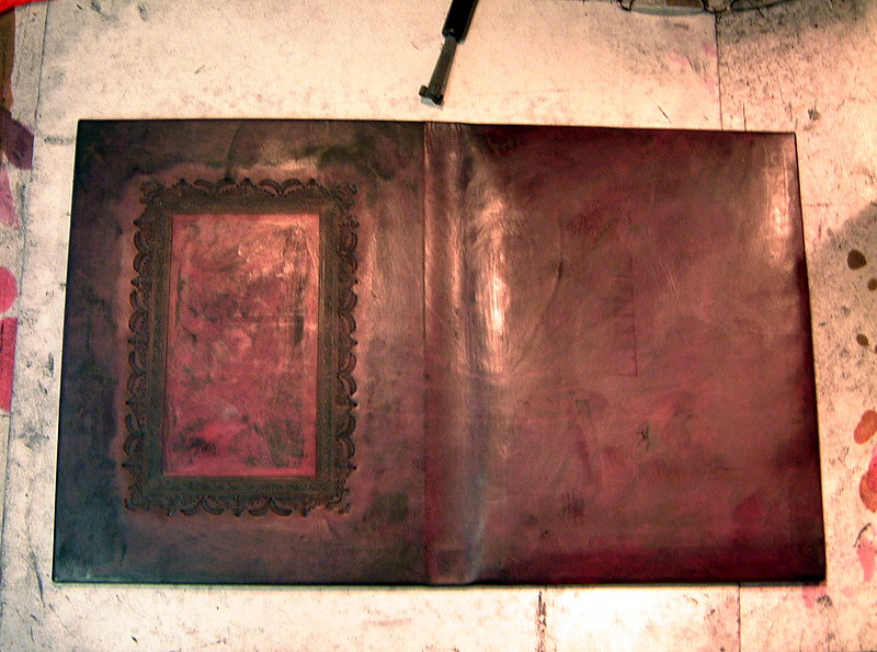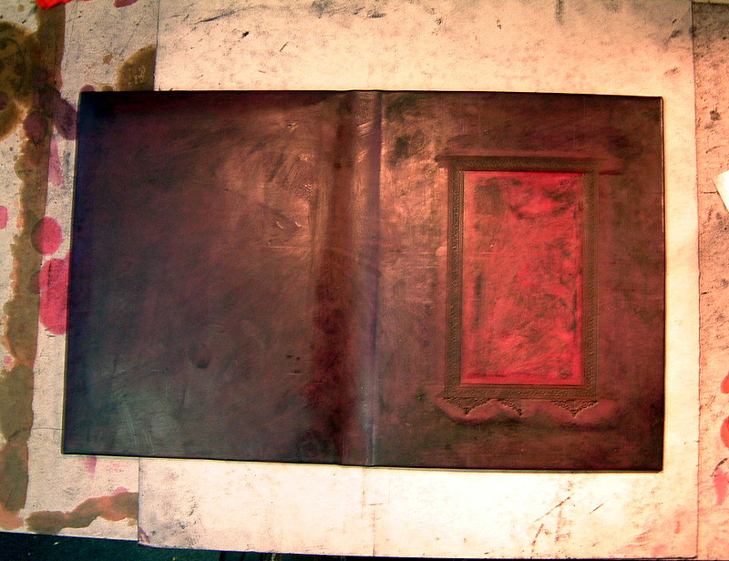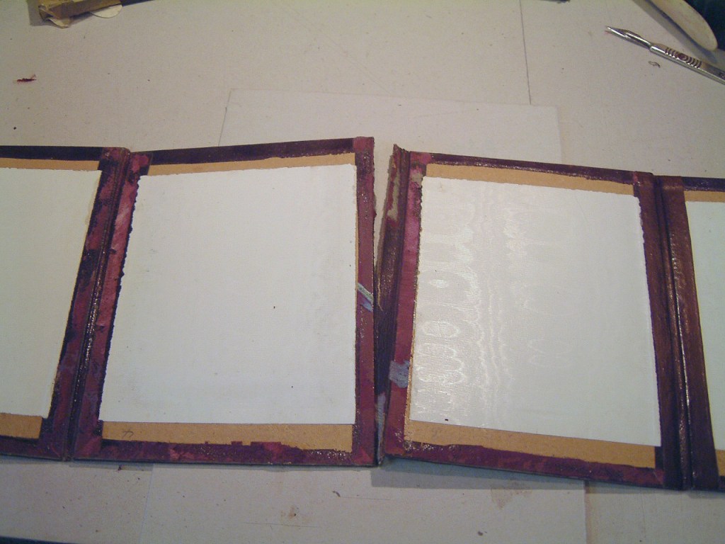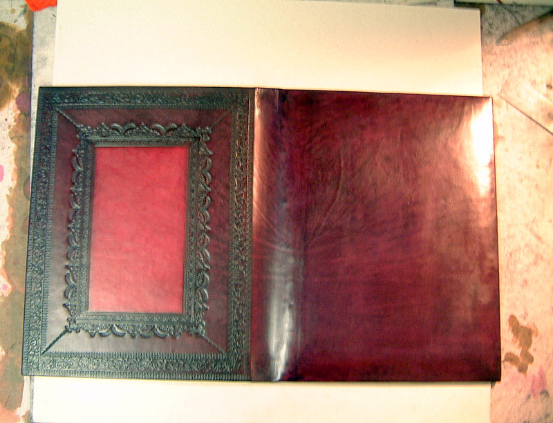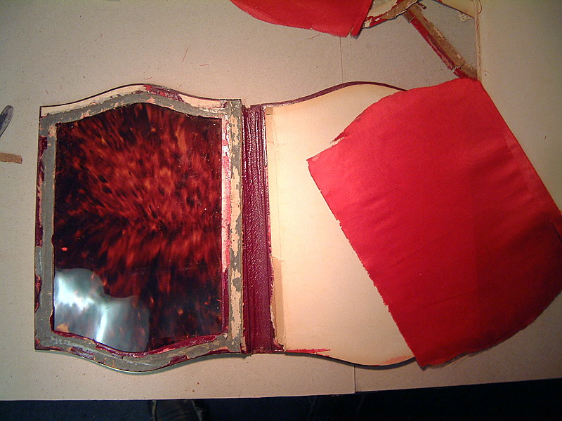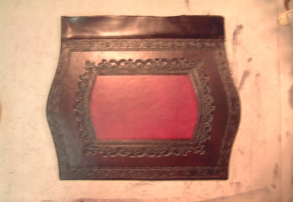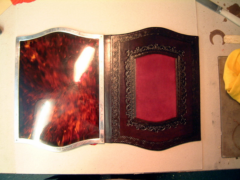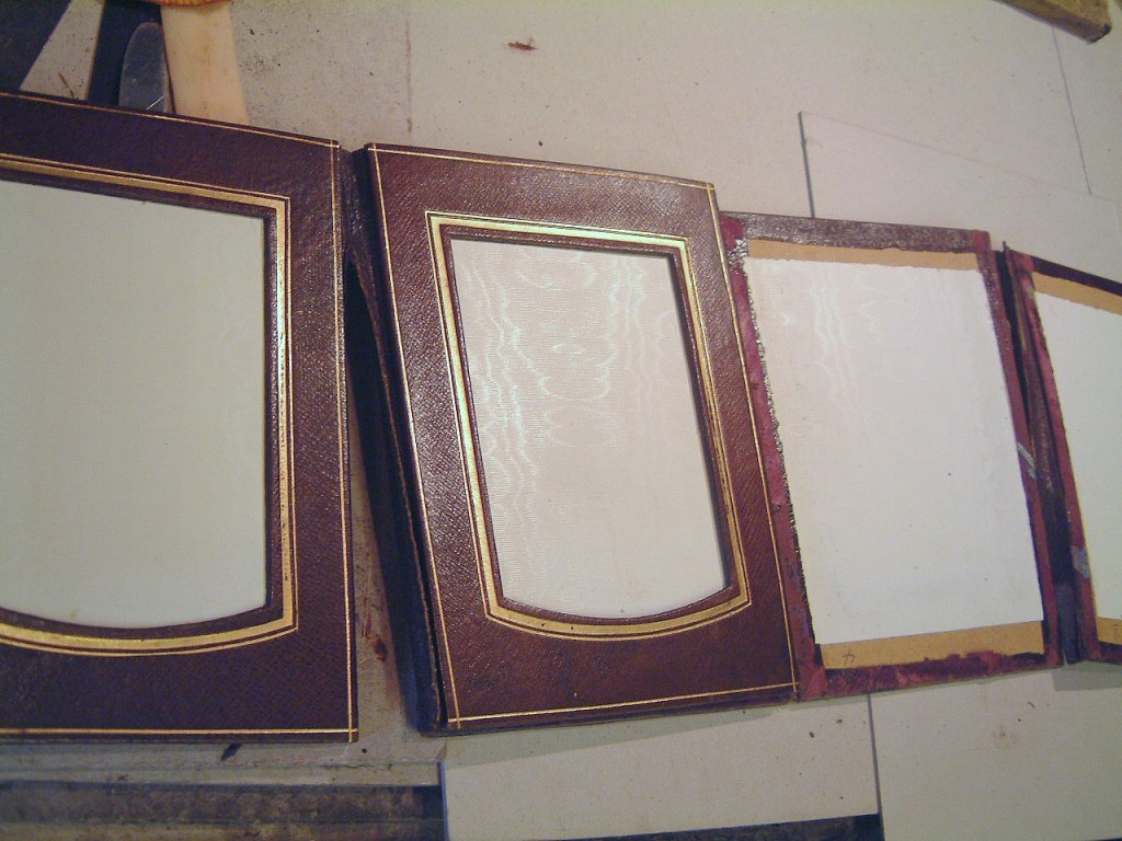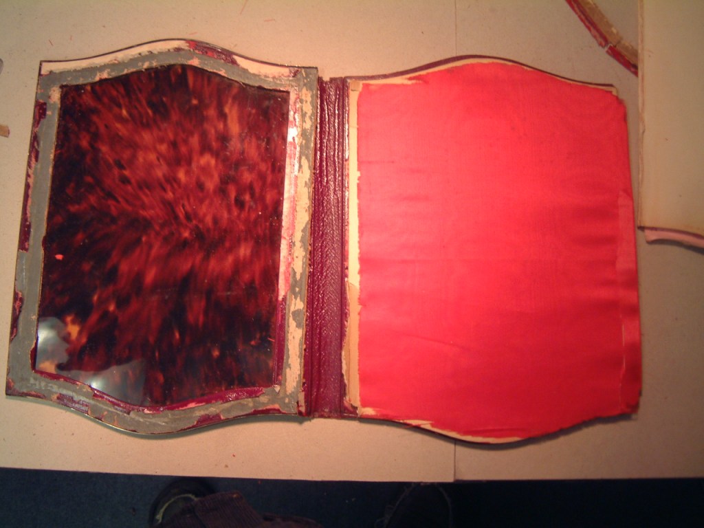 I’ve removed the silk from the liners and I’m re-using the original liner boards and re-make with new matching silk. The tortoiseshell and silver frame are cleaned and restored and a new back is cut,shaped and covered in a natural veg tanned calf which is then coloured using 2 fermented vegetable dyes. The cover is then coated with a “tallow” to prevent the tools burning into the surface of the leather.