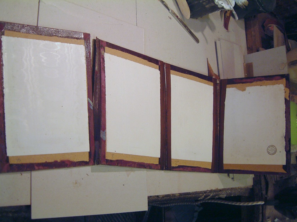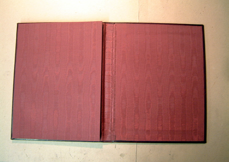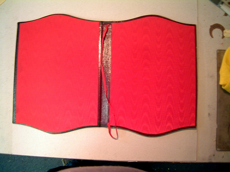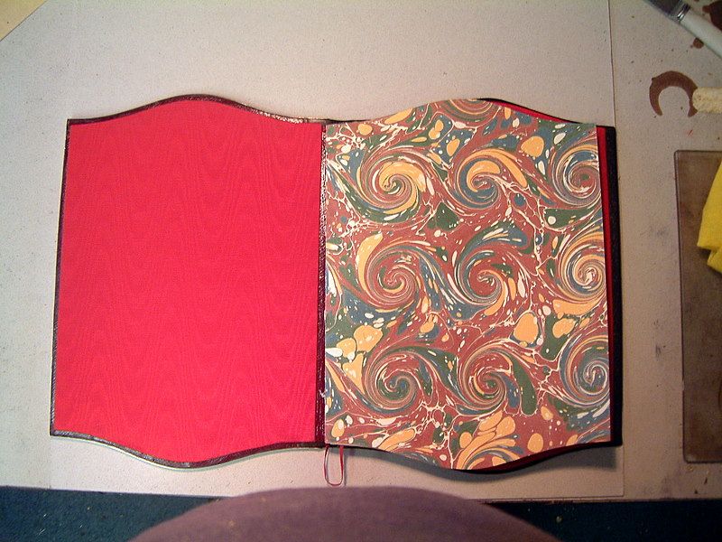 The tallow is removed after blind tooling and the covers married together. The silk linings are glued in place and a silk ribbon is attached to the spine centre to hold in the original blotter. After restoration it is lined with a hand marbled paper cover.
