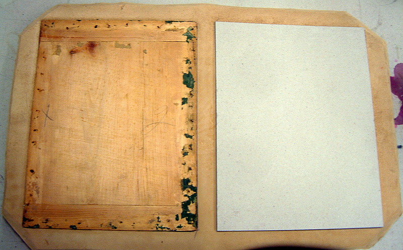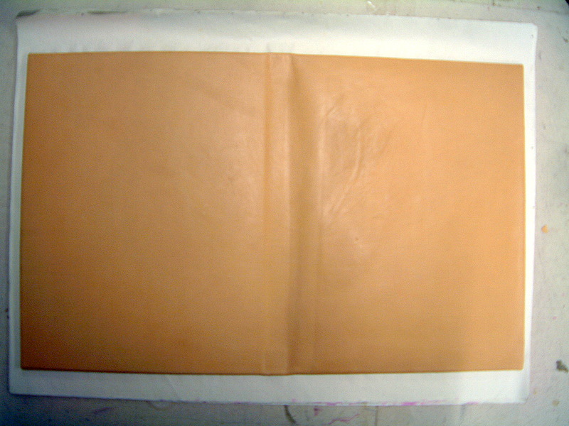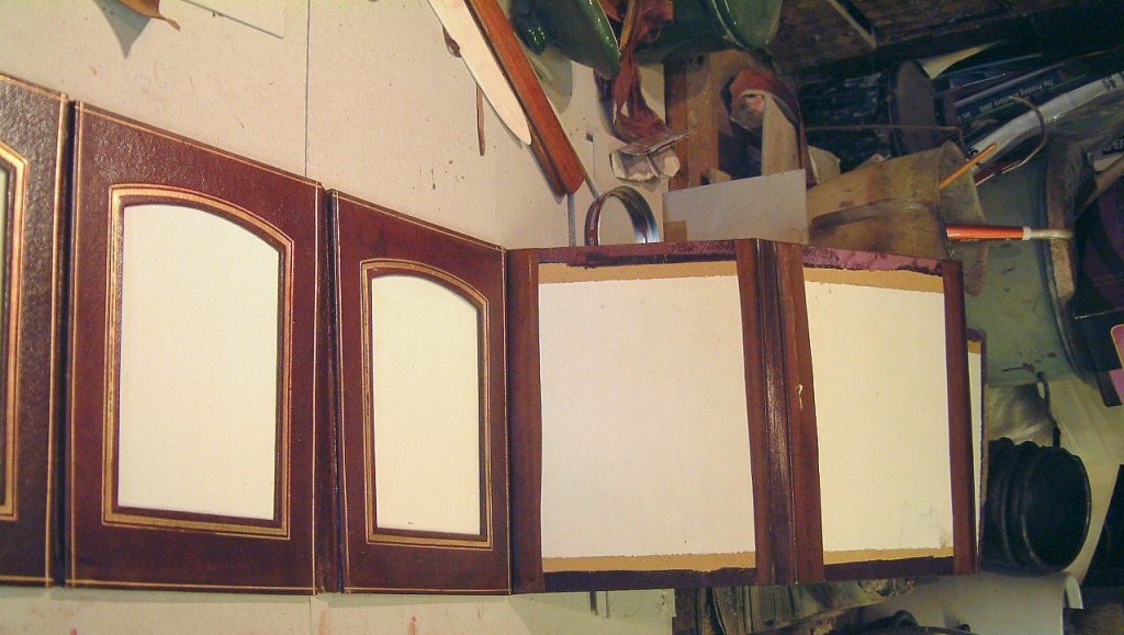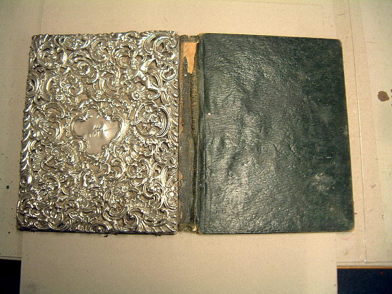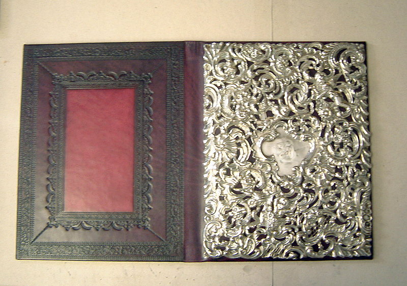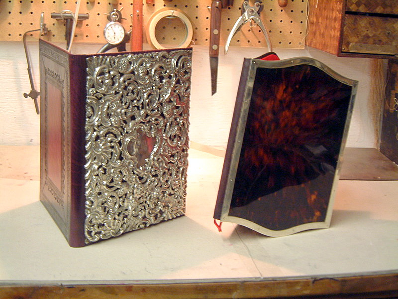So first I’m going to carefully remove the silver plate taking care to keep the original nails, and then remove the leather (what’s left of it) from the bevelled wooden board, re-sand the old glue off the wooden board and cut a new board to the same size. New leather is cut and pared and the boards mounted and turned in.