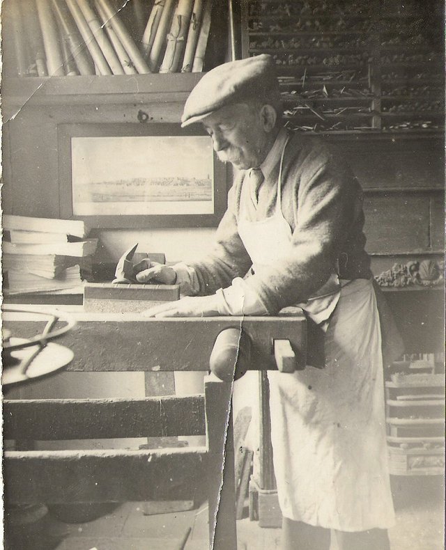 I on the other hand am showing you exactly how much pressure is needed when nipping the endpapers on a newly bound folio Bible. It must be summertime in the Old Boy’s workshop as you can see the fire isn’t lit and he is suitably attired for the job. The standard dress for a bookbinder in those days was: