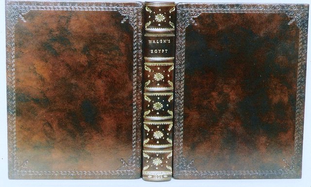 Two examples of hand marbled calf bindings………..Ahh Walshes Egypt 1st edition, hand coloured plates etched on the battlefield…..with a piece of “bloodied bandage” stuck across a torn leaf…..amateur conservation in the field of duty!!