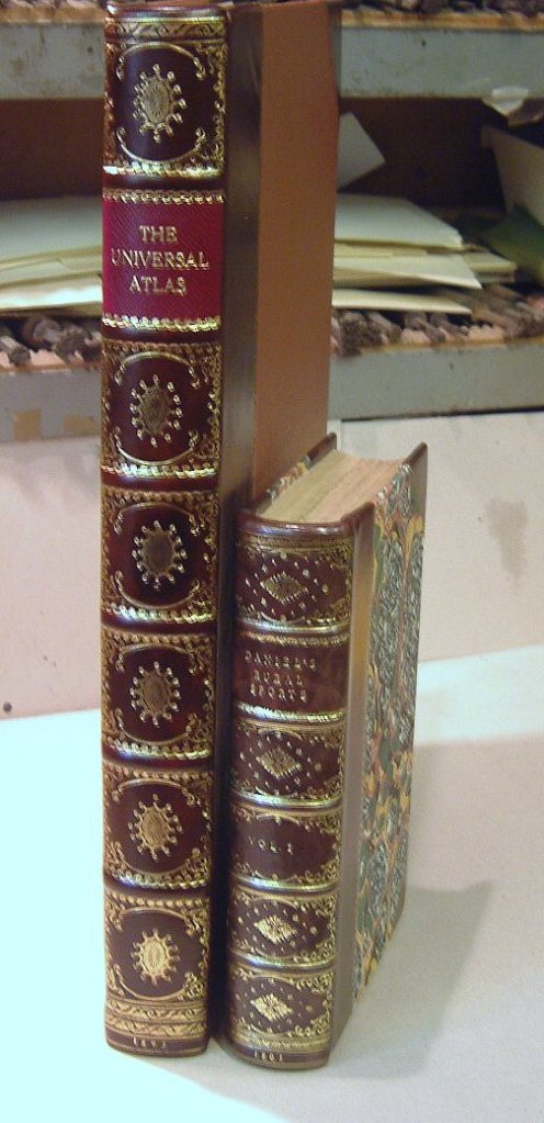 Boards were made and fitted and false raised bands applied. The leather was chosen, cut and dyed using the resin from boiled mahogany chippings and oak bark. The Atlas was bound as a ½ binding with brown Victorian Jaconette cloth sides to match, and the spine decorated in gold leaf.