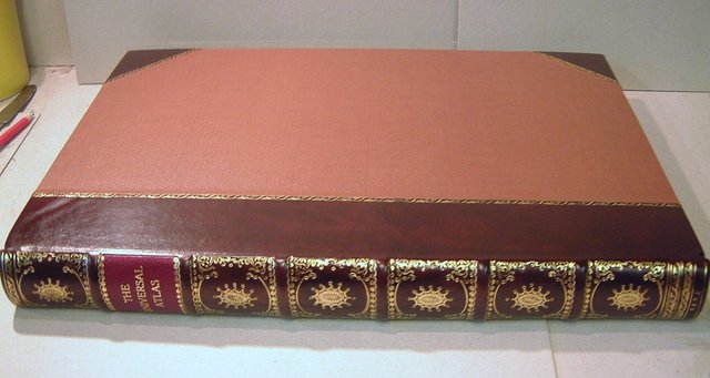 After the pages were restored the Atlas was re-sewn on sunken cords incorporating its original compensation guards, the spine then re-rounded, and backed, head and tail bands were sewn in and the spine suitably lined incorporating a manilla hollow back.